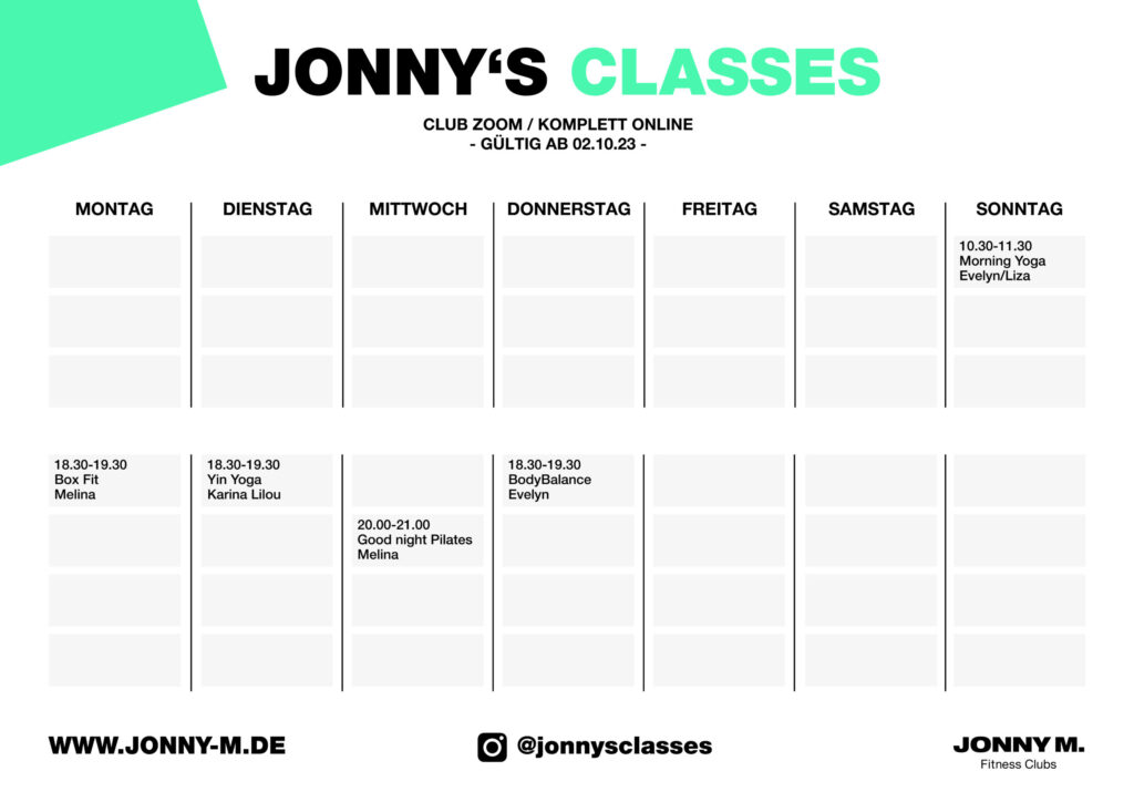 Hier findest du den Kursplan für unsere JONNY M. ZOOM Kurse. Klicke dich rein und nimm ganz einfach von zu Hause teil.
